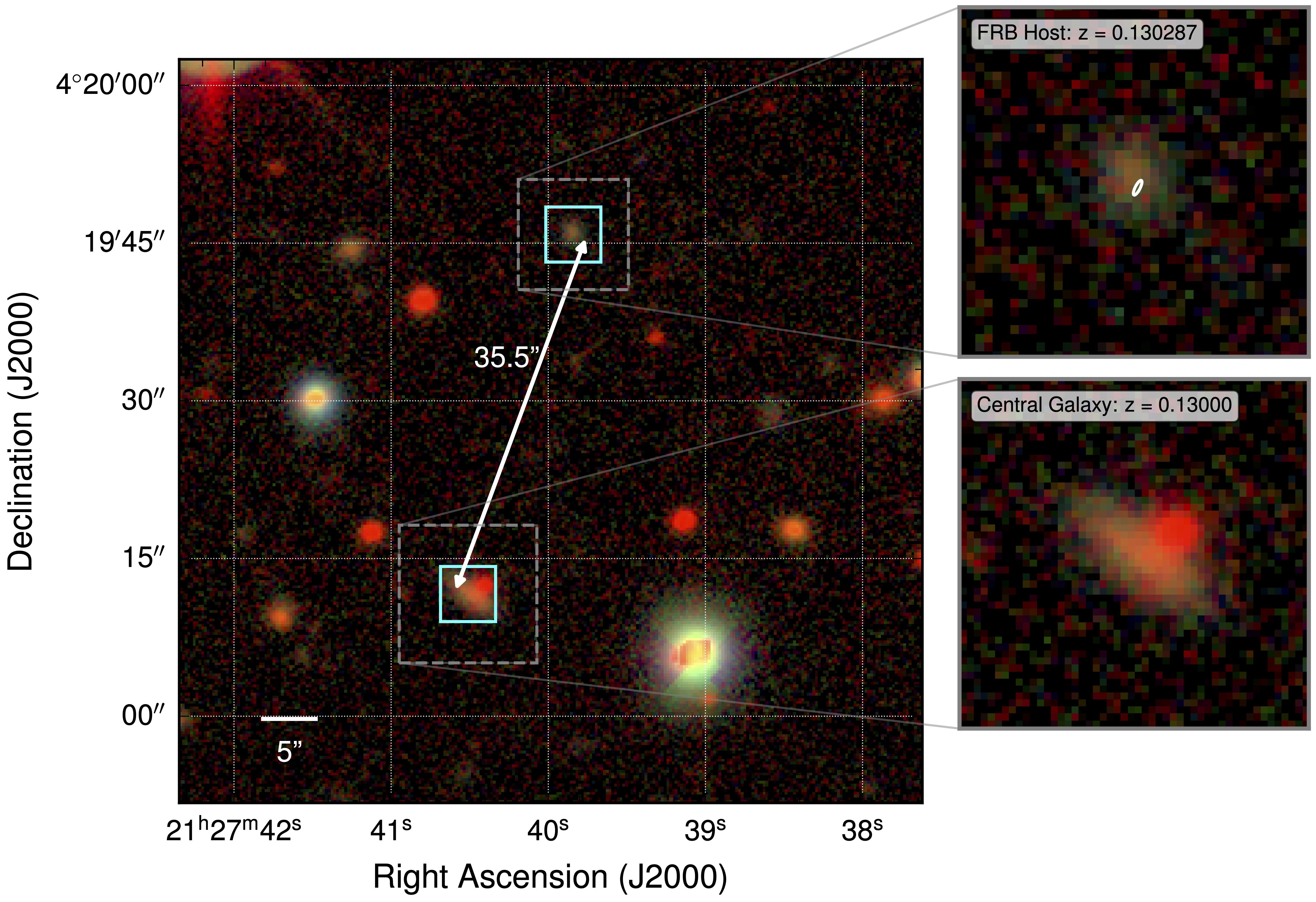 The results are presented in a paper entitled "A Hyperactive FRB Pinpointed in an SMC-Like Satellite Host Galaxy", which will soon be published in the Astrophysical Journal Letters. The figure above gives a wide-field red-green-blue (RGB) view of the FRB 20240114A field using DESI data. It shows the FRB host and EVN localisation ellipse as well as the central massive galaxy.